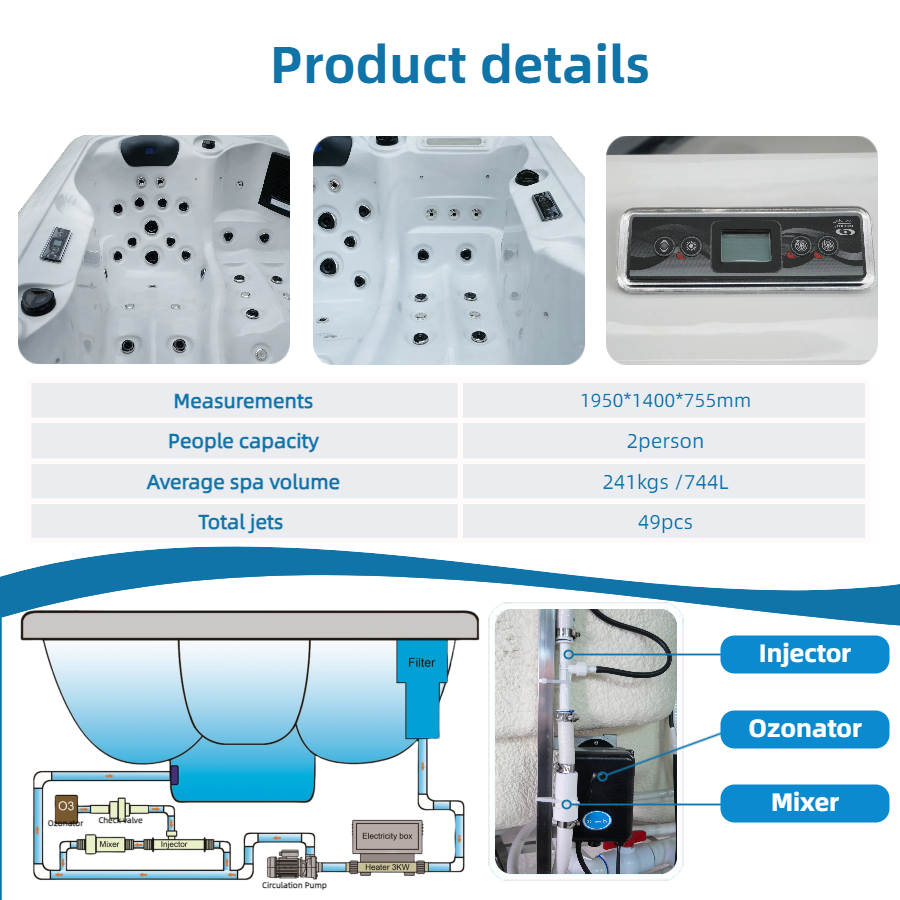 Hinn two-person freestanding spa hot tub is designed for maximum comfort without taking up excessive space. Its compact footprint makes it a perfect fit for smaller outdoor areas, such as backyards, balconies, or commercial spa facilities where space is limited. Despite its compact size, the tub offers generous seating for two people, ensuring a relaxed and intimate soak. The ergonomic design and strategically placed jets ensure that both users can enjoy a comfortable and therapeutic experience simultaneously.